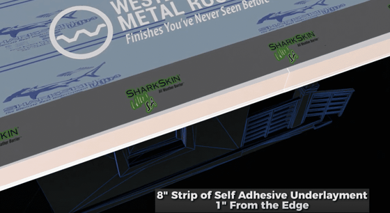 In addition, cut an eight inch strip of Sharkskin Ultra SA underlayment and install it over the eave flashing as shown in the picture and video. Once this is done you will have underlayment both underneath and over the eave trim.