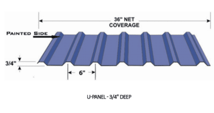 AG Panel is used so often in barn applications that you may also hear it referred to as “pole barn steel” or “U Panel”. This exposed fastener panel is 36" wide with ribs that are 3/4" deep and 9” apart center to center.