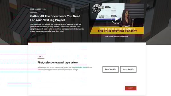 Users of the spec builder tool can customize each document package simply by specifying which panel is required on the project and selecting the desired profile, color, and gauge. The wizard is limited to one panel per session but can be used multiple times to collect the documents they need for other panels on their project by going through the same process multiple times.