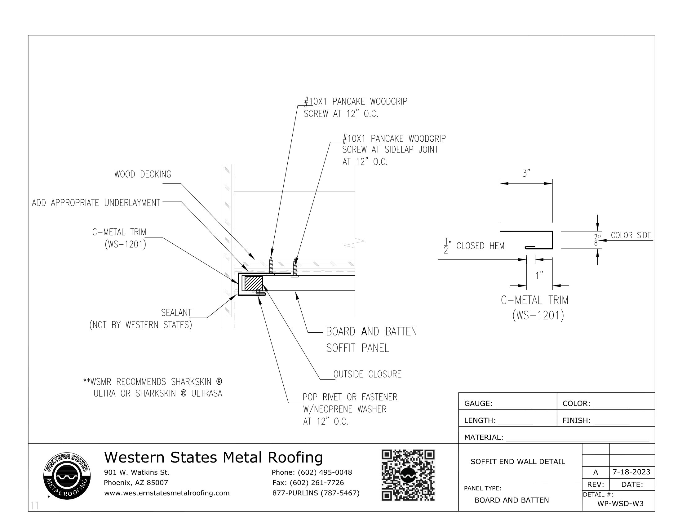 You will need to use this detail when your metal soffit panels end at an end wall. This installation detail is for a metal soffit panel only. It should not be used for metal wall panels.