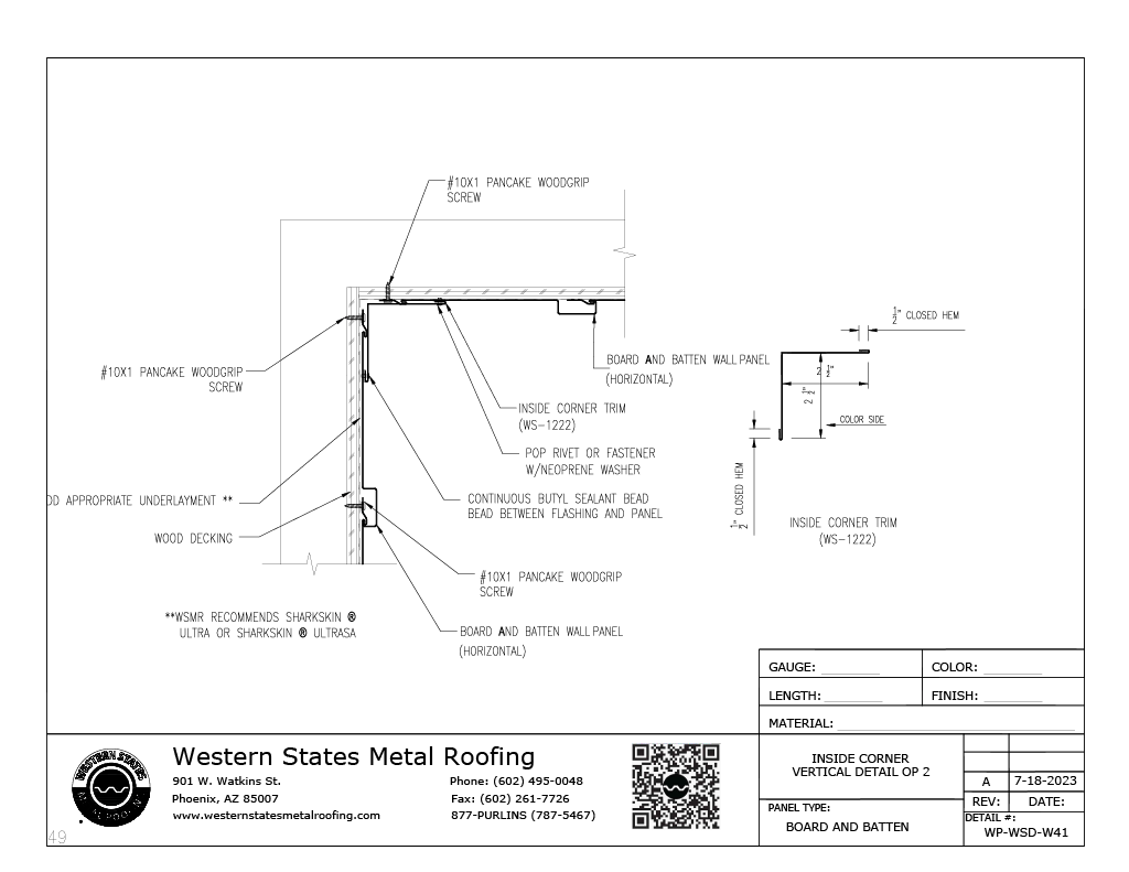 We offer two different types of inside corner trim, but this is the easiest one to install. The trade-off is that it has exposed rivets. This installation detail is different when the panels are installed horizontally versus vertically. This installation detail is for a vertical wall panel only.
