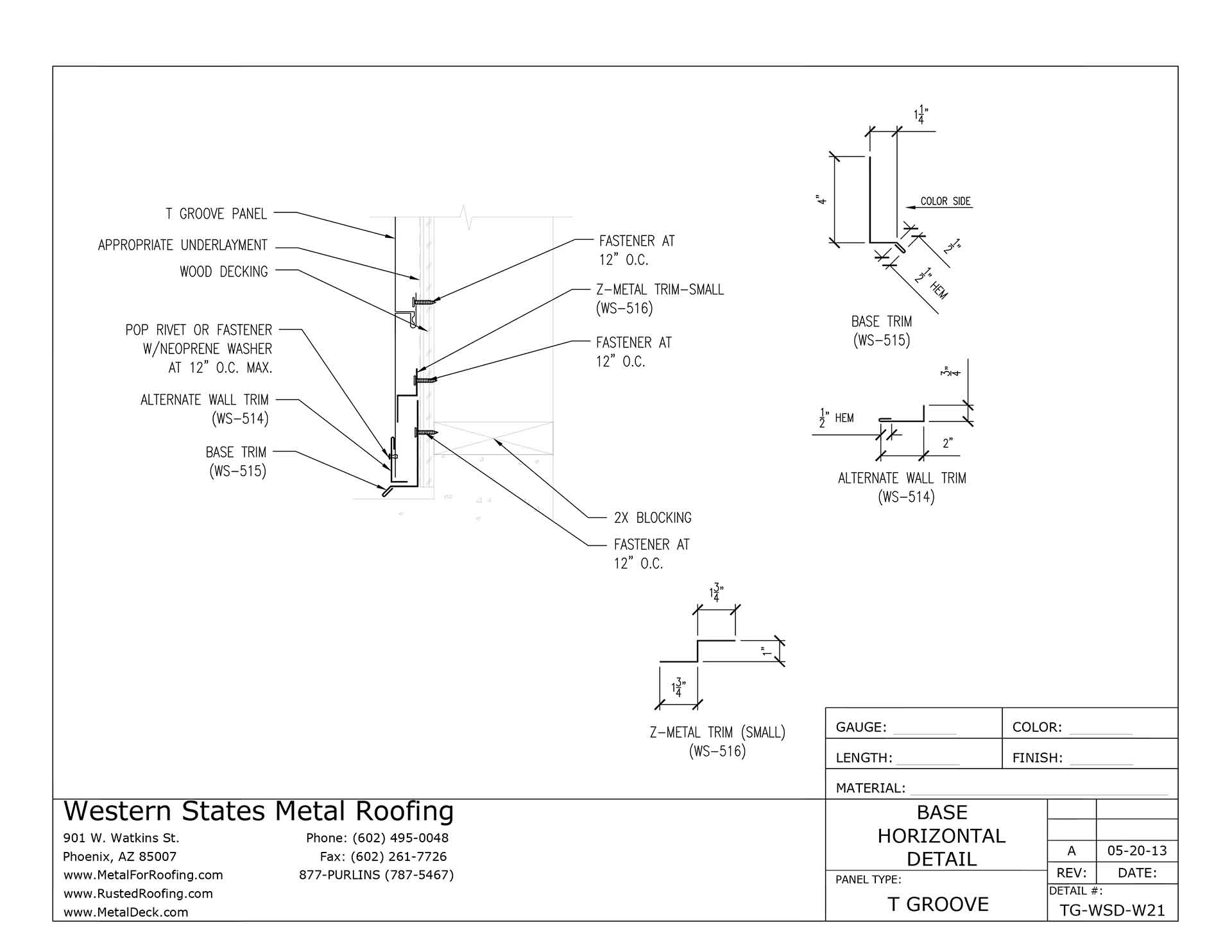 Base trim creates a barrier between the bottom of the metal wall panels and the floor. The base trim detail is different when the panels are installed vertically versus horizontally. This installation detail is for a horizontal wall panel only.